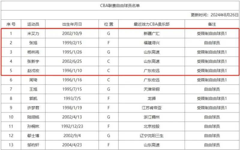 8月26日,CBA官方更新了自由球员名单,名单中新增了5名球员。