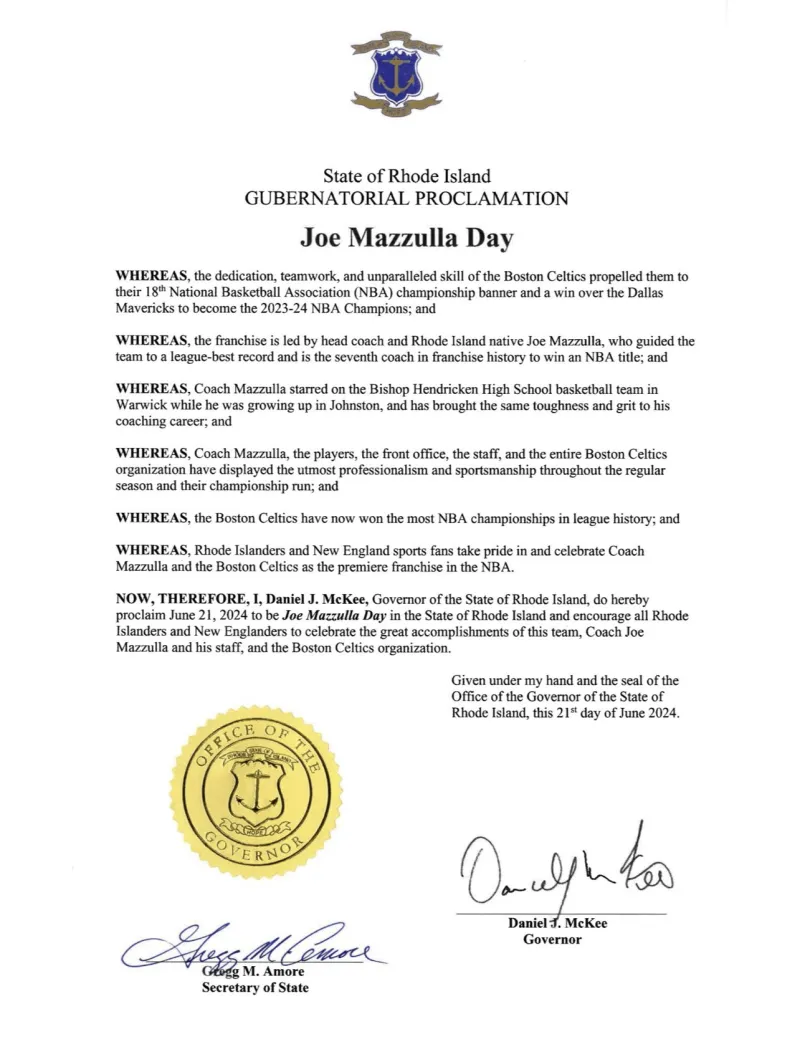 凯尔特人队主帅乔·马祖拉的家乡罗德岛州宣布,6月21日(北京时间22日)将被指定为当地的“马祖拉日”。庆祝马约拉和凯尔特人队夺得总冠军。