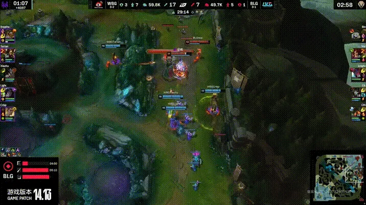 【比赛简介】 比赛初期,两队势均力敌。比赛第19分钟,BLG双C被夹在中路。随后WBG联手拿下男爵,转身打出1换2。