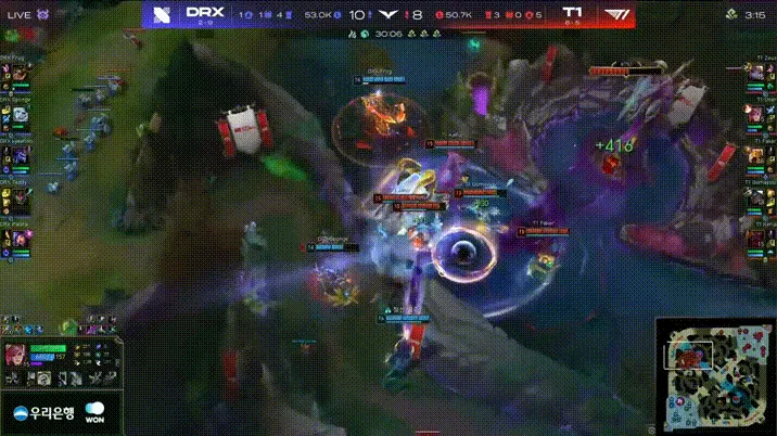 比赛第37分钟,两队爆发龙争虎斗。 Kyeahoo龙王四巨头帮助DRX以2换5的队伍击杀了T1。